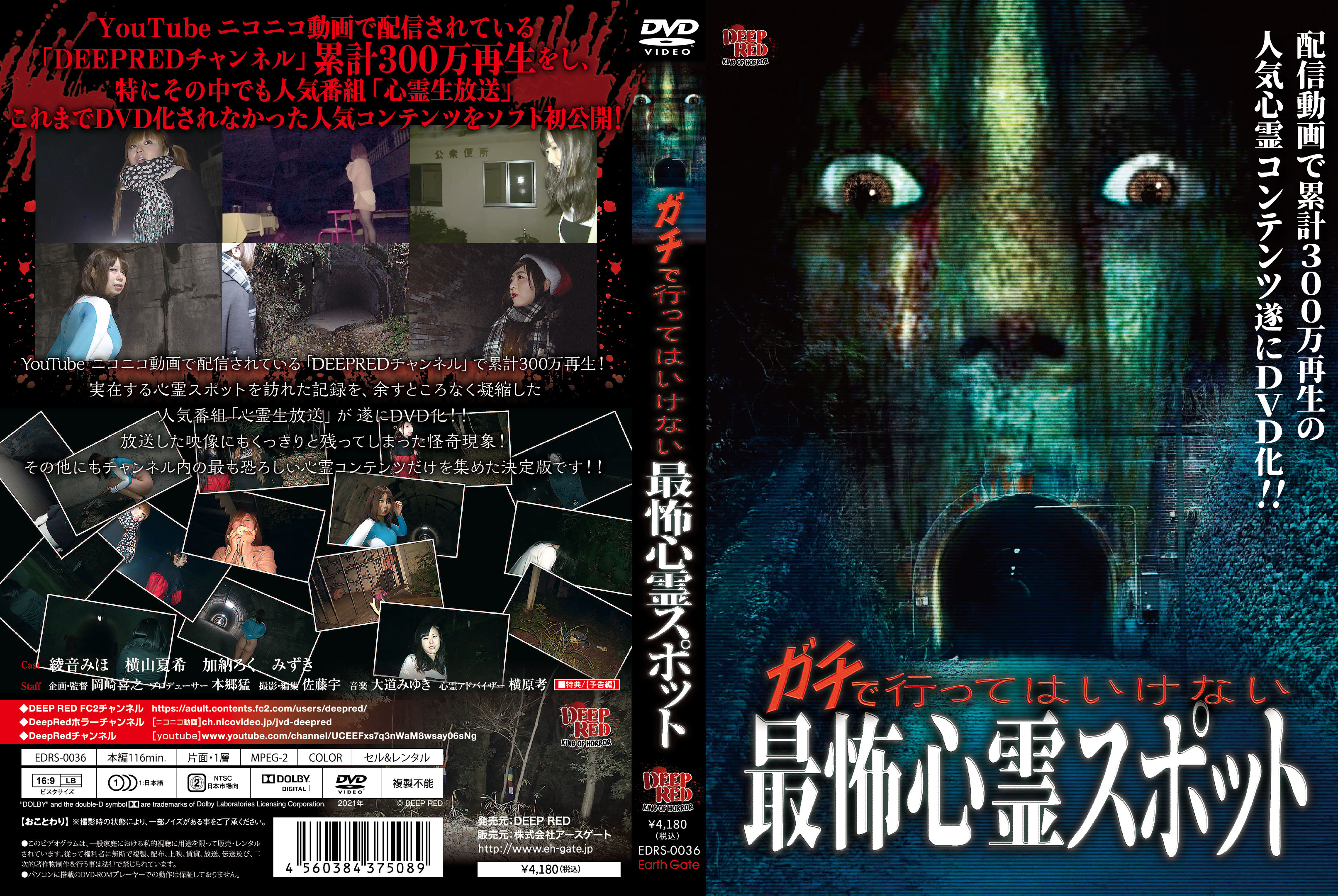 YouTube ニコニコ動画で配信されている「DEEPREDチャンネル」累計300万再生をし、特にその中でも人気番組「心霊生放送」これまでDVD化されなかった人気コンテンツをソフト初公開!その他にもチャンネル内の最も恐ろしい心霊コンテンツだけを集めた決定版です!!